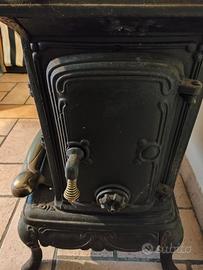 Stufa a legna in ghisa colore nero, griglia di copertura e barre antiscottatura laterali in ottone, piano superiore per scaldare vivande e cucinare con 2 aperture circolari removibili, sportello frontale con vetro termico per vedere la fiamma, 2 ampi sportelli laterali, prese d'aria frontali laterali regolabili, scarico fumi posteriore con diametro 120 mm con valvola di apertura e chiusura manuale, potenza 6 kW, ideale per ambienti da 70 mq, rendimento calorico circa 70 %, peso totale circa 70 Kg. Dimensioni: larghezza frontale 60cm. altezza da terra 75cm. profondità 45 cm. Condizioni pari al nuovo vendo euro 390 non trattabili. (attualmente costa 850 euro) Non spedisco solo ritiro diretto vista e piaciuta.