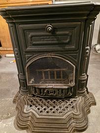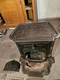 antica e rara stufa in ghisa francese 800,Corneau Freres ,Charleville la stufa nel piano superiore aperto lo sportello si inserivano i piatti per riscaldarli, completa di griglia para scintille , si può collocare all interno di un camino. lavorata nella.piastra superiore ha un aspetto maestosa ed è molto funzionale. Completa di vari accessori visibili in foto .misura la base larghezza 75 ,il piano 64x40 ,altezza 77 cm. base profondità 61 .peso circa 125 kg.
