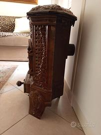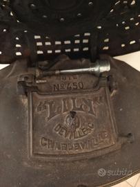 Piccola stufa a legna/calcio d'epoca Art Nouveau in ghisa smaltata marrone , decorata con motivi vegetali classici. Viene venduta solo per decorazione. Può essere utilizzata come porta piante. Questo modello è numerato e il suo nome è "Lily" La manifattura Deville esiste ancora producendo stufe. va ritirata in loco