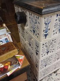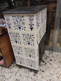 Stufa in terracotta con ricopertura in maiolica e ghisa.