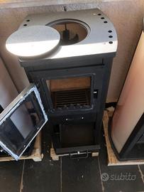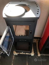Struttura in acciaio verniciato con porta in ghisa e vetro ceramico, camera di combustione in refrattario e scarico fumi superiore Ø 120 mm. Ideale per ambienti fino a 140 m³, garantisce rendimento elevato e consumi contenuti.