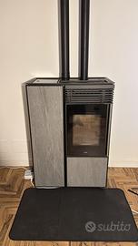 Stufa a pellet ad aria, top in acciaio ad alto spessore, rivestimento in acciaio verniciato, frontale in gres porcellanato, grande visione della fiamma, sistema di pulizia automatico del braciere, ventilazione frontale di serie escludibile, due canalizzazioni (doppia posteriore oppure doppia superiore oppure una destra e una sinistra), funzionamento a convezione naturale a qualsiasi potenza.
