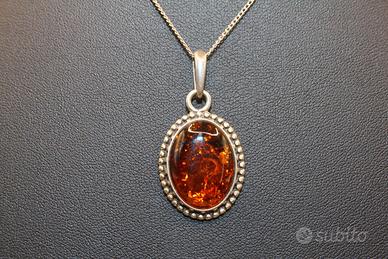Splendida collana con ciondolo in argento e ambra Baltica. Misura 44 cm. Ciondolo 31 x 20 mm.