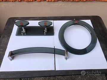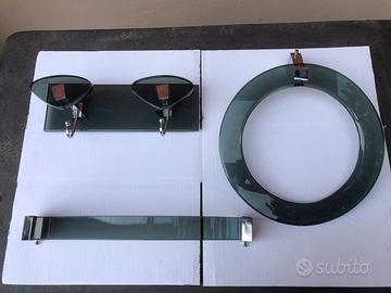 In aggiunta sono presenti il porta asciugamani lineare, quello circolare e l’ appendiabiti a due ganci dello stesso vetro della specchiera, con parti in metallo cromato (l’appendiabiti ha un minuscolo difetto sul retro assolutamente invisibile).