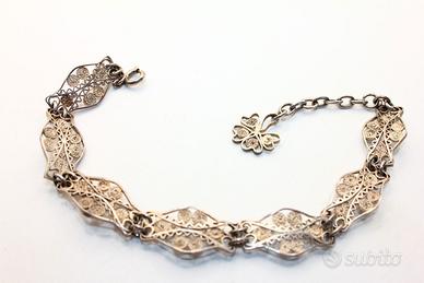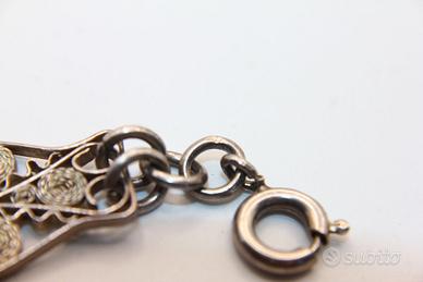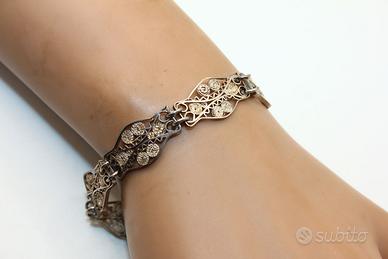 Splendido bracciale antico in filigrana d'argento, un gioiello di raffinata eleganza e maestria artigianale. Lungo 20 cm e alto 12 mm, questo bracciale presenta una delicata e intricata lavorazione in filigrana d'argento con motivi floreali e sinuosi. Un esempio notevole di gioielleria d'epoca, perfetto per aggiungere un tocco di fascino senza tempo al vostro stile.