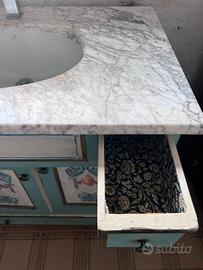 Sormontato da piana in marmo naturale su misura, con doppio lavabo, realizzata da marmista.
