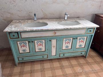 Mobile da bagno artigianale unico, realizzato e dipinto a mano dall’artista bresciano Maurizio Radici, esposto anche alla Biennale di Venezia.