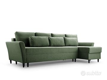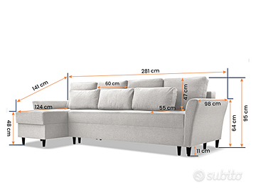 Cerchi un divano dal design pulito, versatile e che duri nel tempo? I nostri divani, prodotti da aziende competenti e specializzate, sono pezzi realizzati ad hoc per soddisfare i tuoi gusti più personali. Questo divano è realizzato con materiali di prima qualità ed è costruito per resistere. La sua struttura è solida e i rivestimenti di alta qualità ne assicurano una resistenza eccezionale all’usura. Personalizzalo con il colore che preferisci e goditi il comfort di un divano creato su misura. Prodotto esclusivo, creato apposta per te. Sottolineiamo che il rivestimento della funzione letto che fuoriesce può essere di colore diverso da quello evidenziato in foto e comunque non è in tinta ed è differente dalla combinazione di colore del divano che si sceglie. Misure: lunghezza 281 cm – altezza 64/95 cm – profondità 141 cm – dimensione letto 124×251 cm Perché il divano Tanzania è così speciale? Materiali robusti e di qualità: anima in legno massello e imbottitura in schiuma di poliuretano ad alta resilienza dalla densità di 40 kg/m3. Piedi in metallo. Cinghie di sostegno in ferro per sostenere il peso e le sollecitazioni con maggiore resistenza Funzione letto: si trasforma in un letto con un semplice gesto, con meccanismo di apertura DELFIN, offrendo una soluzione pratica per ogni evenienza Box contenitore: dotato di un comodo spazio contenitore, ideale per riporre coperte, cuscini, biancheria da letto o altri oggetti Posti: per 4 persone, offre spazio per tutta la famiglia e gli amici Design: presenta uno stile moderno e attuale, con linee pulite e forme armoniose. I braccioli sono obliqui e conferiscono vivacità alla sua forma, mentre la seduta è morbida e fornita di due file di cuscini imbottiti per la schiena Versatilità: la sua forma angolare lo rende perfetto per ottimizzare gli spazi. La funzione letto e il box contenitore lo trasformano in un elemento multifunzionale, ideale anche per piccoli ambienti.