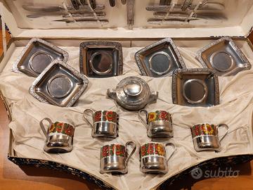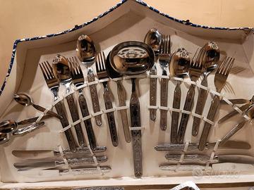 Stupendo servizio di posate e di tazzine da caffè vintage Inoxriv Made in Germany. Mai utilizzato, ancora nella sua preziosa ed elegante custodia originale, non ha nessuna imperfezione e le posate sono praticamente come nuove. Addirittura il porta zucchero ha ancora la plastica di protezione. Le posate sono tutte realizzate in acciaio Inox. Il Set include forchette, coltelli, cucchiai e altri utensili da portata e completata da tazzine da caffè con piatti abbinati. Le tazzine sono finemente decorate con un motivo floreale.
