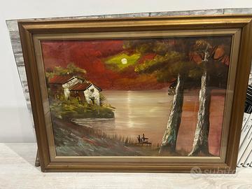 Vendo affascinante dipinto olio su tela raffigurante un paesaggio lacustre/montano al chiaro di luna. L'opera si distingue per uno stile materico deciso e un uso vibrante del colore, con un cielo dalle tonalità rosso scuro che dona all'ambiente un'atmosfera unica e suggestiva.