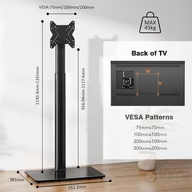 【Supporto TV da Pavimento Universale】Il porta tv da terra si adatta alla maggior parte dei televisori LED LCD da 19 a 43 pollici. Capacità di peso: 45 kg. Modelli VESA disponibili: 75mm x 75mm, 100mm x 100mm, 200mm x 100mm, 200mm x 200mm