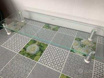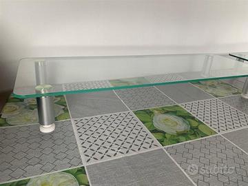Supporto ergonomico per TV o monitor in vetro temperato, da mettere sopra la scrivania o un mobile.