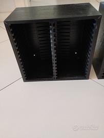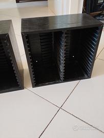Vendesi due scaffali supporto/espositore porta CD, materiale legno, colore nero, capienza 30 ciascuno, dimensioni lunghezza 26 cm larghezza 28 cm profondità 15,5 cm