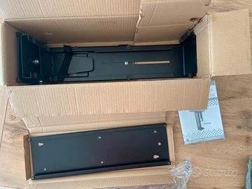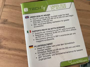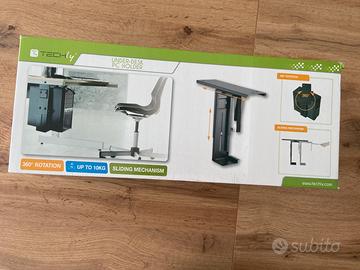 Supporto Techly in metallo nero per PC computer da sotto scrivania, regolabile in larghezza da 88 a 203 mm e in altezza da 300 a 533?mm, con meccanismo girevole di 360º ed estraibile scorrevole così da accedere facilmente al PC.