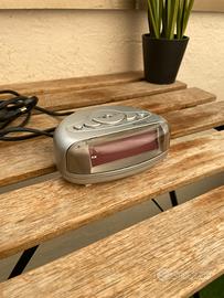 Sveglia digitale compatta dal design moderno e curvo, color argento satinato. Perfetta per il comodino grazie ai grandi numeri LED rossi ben visibili anche di notte. Facile da impostare e dotata di funzione Snooze per i più dormiglioni. In ottime condizioni e perfettamente funzionante. Caratteristiche tecniche • Marca: Europa Technology • Display: LED digitale a cifre rosse ad alta visibilità • Funzioni: Orario (12/24h), Sveglia programmabile • Comandi: Tasti fisici superiori (Hour, Min, Time, Alarm, Snooze) • Selettore Allarme: Switch ON/OFF dedicato • Alimentazione: Cavo di rete integrato (presa standard) • Colore: Silver / Grigio metallizzato