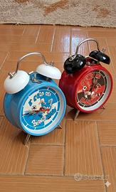 In vendita coppia di sveglie meccaniche. Queste sveglie sono caratterizzate da grafiche vivaci in stile fumetto e scocche in metallo lucido.