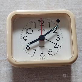 Sveglia al quarzo marca Emes quarts di manifattura tedesca potrebbe essere degli anni settanta unico difetto illuminazione interna non funzionante ma il movimento e la sveglia con cicalino elettronico che parte da un suono delicato poi un po' più forte e poi fortissimo sono perfettamente funzionanti, lo chassis il colore bianco un po' ingiallito dal tempo in maniera uniforme si nota aprendo il vano batterie.Rif.2408200817.