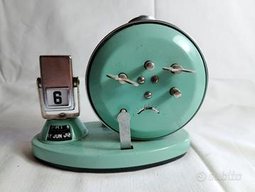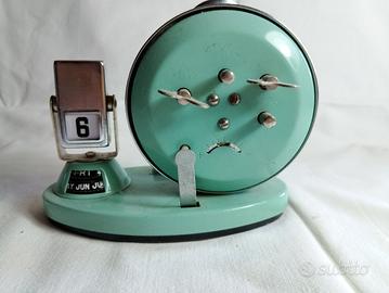 L'immagine mostra una sveglia da tavolo vintage della marca "Golden Cock" con un calendario a ribalta integrato.