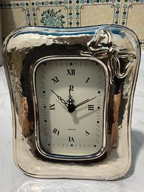 Elegante sveglia da tavolo con una finitura in argento martellato e un grazioso fiocco decorativo.