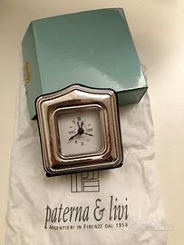 Sveglia Paterna e Livi con rifinitura argento 925/1000. Retro in velluto blu. Con garanzia prodotto. Misure 8,5x9,5 cm (punta).