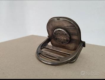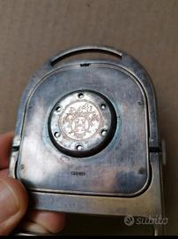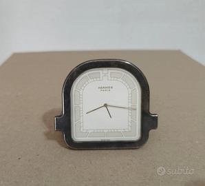 Sveglia portatile da viaggio vintage Hermés, in metallo argentato, base pieghevole, quadrante senza numeri. Placcata in argento, non ci sono punzoni che indichino che è in argento. Sul retro logo di Hermes. Dovrebbe funzionare,molto probabilmente c'è solo da sostituire la batteria. Da lucidare.