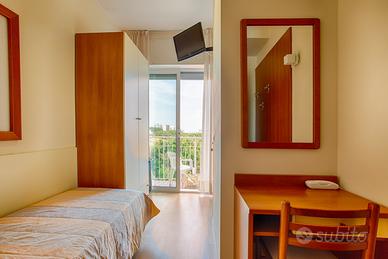 Testiera letto ( 24 matrimoniali e 3 singole ) con reti ortopediche, comodini e abat-jour , armadio con cassettiera, scrivania con sedia, specchiera, plafoniera principale , terzo punto luce, mobile porta-valigia e porta-frigobar, eventuale porta ingresso camera e scorrevole bagno.