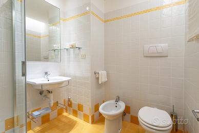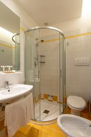 Box doccia in cristallo con rubinetteria e sali scendi non incassati , lavabo in ceramica con piccola mensola, water e bidet a pavimento, rubinetteria completa, eventuali accessori bagno.