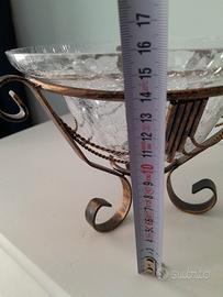 La coppa è realizzata in vetro craquelé, celebre per la sua trama a "ragnatela" che cattura e scompone la luce in mille riflessi. Il supporto è un piccolo capolavoro di carpenteria artistica dal peso importante (395 grammi), fatto a mano con motivi a volute e finitura bronzo antico.