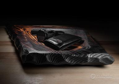 Bellissimo svuotatasche in legno massello di frassino interamente scavato e sagomato a mano, successivamente bruciato con tecnica di lavorazione giapponese. Pezzo unico dal laboratorio Primitive di Milano. Misure 65x32x5 cm