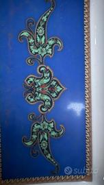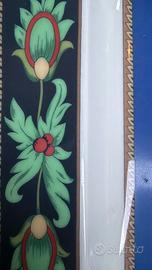 Design: Presenta un ricercato decoro floreale e vegetale nei toni del verde e del rosso su un bordo esterno blu, incorniciato da profili dorati. Al centro spicca un inserto rettangolare blu con motivi ornamentali a volute (paisley).