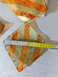 Nr. 3 piatti identici decorativi realizzati in vetro. Design con bande colorate arancioni e oro, dettagli glitterati, forme irregolari e moderne. Utilizzabile come svuotatasche o centrotavola, portaoggetti decorativo o posaceneri. Rettangolare per un look moderno ed elegante con angoli rivolti verso l'alto. Dimensioni 20cm x 16cm. Ottimi le condizioni, mai utilizzati.