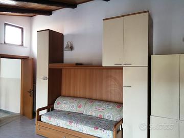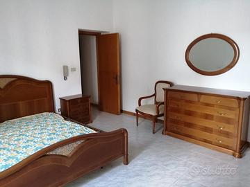 Camera matrimoniale in legno massello, Mastrogeppetto, composta da letto matrimoniale, rete ortopedica, due comodini, un comò, armadio sei ante, sedia, soggiorno con tavolo tondo, tavolo cucina rettangolare, cucina bianca, soggiorno in legno, tavolo tondo, divano letto con poltrona camera singola con letto ponte, due lavatrici, libreria. Trasportare a 10 km di distanza una casetta in legno prefabbricata