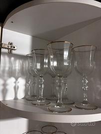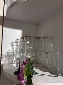 Calici da vino e flûte con raffinato bordo dorato e stelo lavorato.