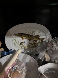Piatto ovale da portata e zuppiera coordinata con splendide illustrazioni realistiche di pesci.