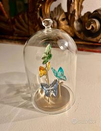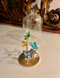 articolo collezione Jungle Beats con campana di vetro e farfalle multicolor. oggetto raro, quattro farfalle in cristallo Verde, oro, azzurro chiaro, azzurro scuro, 296 sfaccettature per ogni farfalla garantiscono luminosità eccellente. la base e i rami sono lavorati in metallo spazzolato color oro e champagne. campana di vetro removibile realizzata in vetro. dimensioni 10.5 * 6.5 * 6.5 designer Heinz Tabertshofer