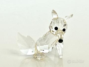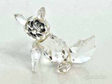 Elegante figura Swarovski in cristallo trasparente raffigurante un volpino seduto. Dettagli accurati con occhi e naso neri.