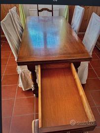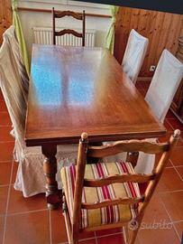 Table de salle à manger avec 6 chaises, style Louis XIII. 2 rallonges et tiroir.