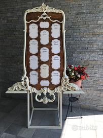 Vendo cornice di legno in stile barocco color bianco avorio con sfondo in legno color noce con supporto in legno bianco. Usata come tableau de mariage per matrimonio.