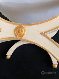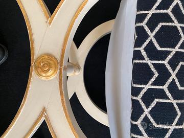 Coppia di taboretti francesi stile impero dalla classica forma "tenaglia", decorazione dorata con rosetta centrale coerente con lo stile " primo impero" come pure i piedini sferici. Probabilmente e uno stile transitorio tra il luigi XVI e il primo impero. restaurati e rifoderati recentemente con un moderno tessuto vagamente optical in bianco e nero.