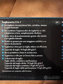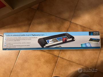 Tagliacarta United Office 2 in 1, ideale per tagliare foto, cartoline, stampe o carta laminata. - Taglio di precisione con tabella e righello laterale. - Leva per un taglio veloce ed efficiente. - Rullo per un lavoro fine e preciso. - Possibilità di cambiare da tagliacarta a rullo a tagliacarta a leva. - Tre diversi tipi di taglio: dritto, ondulato e perforazione. Confezione non aperta, regalo non gradito