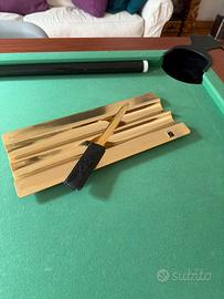 Il manico ergonomico rivestito in pelle nera garantisce una presa stabile e confortevole, mentre le finiture cromate e dorate donano all’oggetto un’eleganza discreta e professionale.