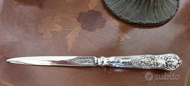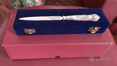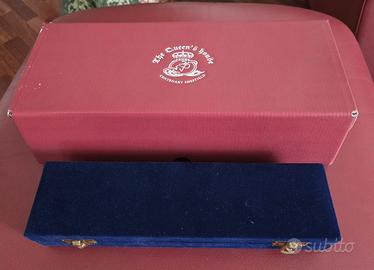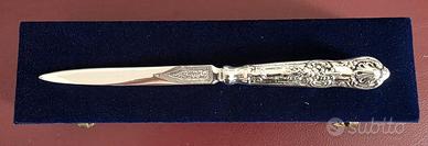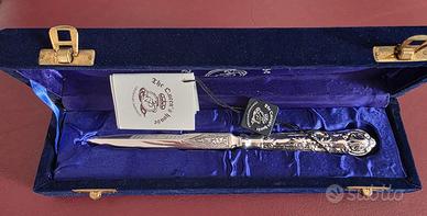 Raffinato tagliacarte inglese “The Queen’s House”, realizzato in Sheffield e completo di astuccio originale in velluto blu e scatola protettiva. L’oggetto presenta una linea elegante e classica, ideale sia come accessorio da scrivania sia come pezzo da collezione. Il tagliacarte è in ottime condizioni, con finiture di qualità e un design che richiama la tradizione artigianale inglese. L’astuccio in velluto blu e la scatola originale lo rendono perfetto anche come idea regalo. Oggetto ricercato per amanti dei prodotti inglesi, della cancelleria di pregio e dei collezionabili da scrivania.