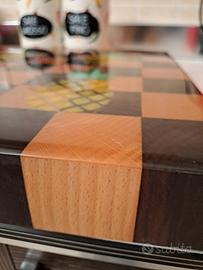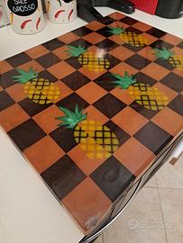 Vendo tagliere artigianale realizzato a mano in legno massello con lavorazione a scacchiera. Le incisioni a forma di ananas sono state riempite con resina colorata e rifinite con resina alimentare. 📏 Dimensioni: circa 45 x 35 x 4,5 cm Ogni fase della lavorazione è stata eseguita manualmente e distribuita su più giorni: preparazione del legno, incisione, colata della resina e finitura finale. Completamente utilizzabile su entrambi i lati. Essendo un prodotto realizzato a mano, ogni tagliere ha sfumature e dettagli che lo distinguono da qualsiasi produzione in serie. Non è un prodotto industriale ma un vero lavoro artigianale. Condizioni: nuovo