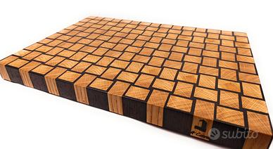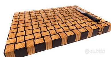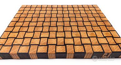 Realizzato Artigianalmente in Italia con la Tecnica End Grain (il Legno di Testa va a formare la Superficie di Lavoro) che Permette una Maggiore Resistenza alle Tracce di Tagli e Garantisce una Vita più Lunga all'Affilatura dei Coltelli. Piedini in Silicone per una Maggiore Stabilità, Fessure sui Lati per Facilitare la Presa. Il Tagliere è Rifinito con una Miscela di Olio Minerale e Cera d'Api ,Certificati per Uso Alimentare,che Creano una Finitura Resistente e Duratura. Non sono Presenti Vernici, Tutti i Colori del Tagliere sono Dovuti alle Varie Essenze di Legno Intarsiate. Prodotto in Italia con Legno Massello di Prima Scelta e con Materiali Adatti all'Uso Alimentare a Partire dalla Colla per Finire all'Olio Minerale e alla Cera d'Api. Ideale come Utensile da Cucina e per Esporre in Tavola le Vostre Pietanze o come gradevole Regalo.