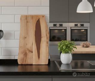 Realizzato interamente a mano, il tagliere conserva il suo fascino primordiale grazie al bordo "Live Edge" (naturale), che segue la silhouette originale del tronco. Le fessure naturali del legno sono state sapientemente colmate con un intarsio in resina epossidica color Terra di Siena, creando un contrasto cromatico caldo e sofisticato che si sposa perfettamente sia con ambienti rustici che con cucine moderne e minimali.