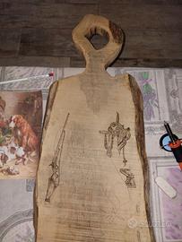 Cedo Tagliere in legno massello antico pregiato ricavato da tavola di Olmo (di circa 200 anni), con disegno a mano libera marcato con penna a fuoco inerente a scena di caccia Vintage. Dimensioni medie circa cm. 65,00 di lunghezza, cm. 30,00 di larghezza e spessore cm. 4,00.