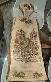 Cedo Tagliere in legno massello antico pregiato ricavato da tavola di Olmo (di circa 200 anni), con disegno a mano libera marcato con penna a fuoco inerente a scena di caccia Vintage. Dimensioni medie circa cm. 65,00 di lunghezza, cm. 30,00 di larghezza e spessore cm. 4,00. Contattare Alessandro