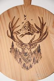 Vendo questo tagliere con rappresentato un cervo nella natura. Disegno realizzato con il pirografo. Perfetto come arredamento per taverne. Circa 40 cm di diametro.