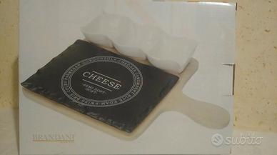 Tagliere Degustazione Formaggi Brandani tagliere degustazione formaggi! Un tagliere in bamboo naturale, dotato di manico, sul quale poggiano una superficie in porcellana con stampe a tema “formaggi” e tre ciotoline (in pezzo unico) in porcellana. Materiale: bamboo, porcellana