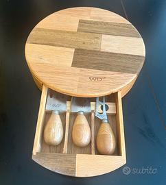 Tagliere di legno con cassetto estraibile contenente 3 coltellini adatti ai diversi formaggi. Mai utilizzato. Alto 6 cm x 25 cm di diametro. Roma Monteverde